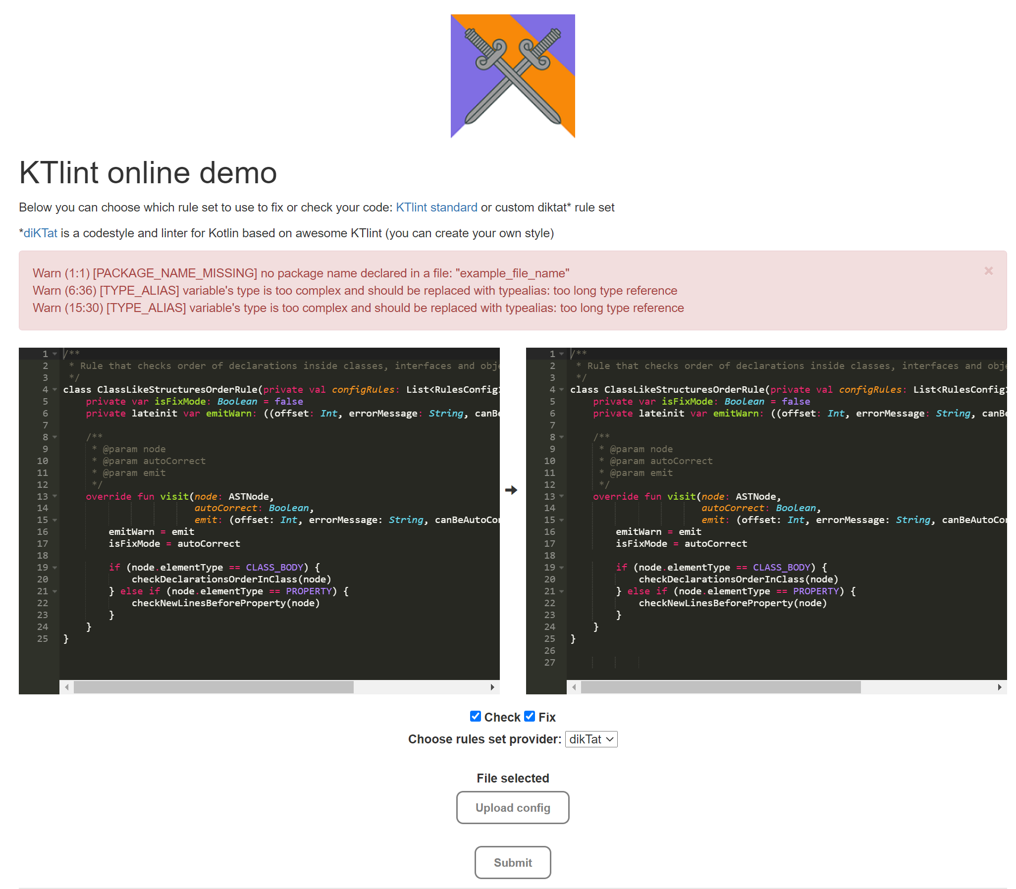 Yes, you can use online demo that we have created for both diktat and ktlint here: https://ktlint-demo.herokuapp.com/demo